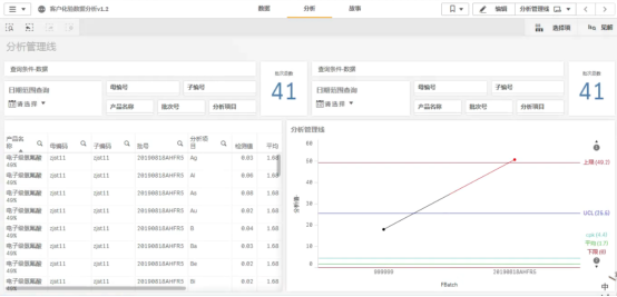 客戶化驗(yàn)數(shù)據(jù)單的結(jié)果,通過(guò)BI的方式展現(xiàn)。數(shù)據(jù)的維度是批號(hào),度量是化驗(yàn)項(xiàng)目的檢驗(yàn)值。查詢條件分成兩塊:一是根據(jù)日期范圍、母編號(hào)、子編號(hào)、產(chǎn)品名稱、批次號(hào)、分析項(xiàng)目來(lái)檢索數(shù)據(jù);二是根據(jù)日期范圍、母編號(hào)、子編號(hào)、產(chǎn)品名稱、批次號(hào)、分析項(xiàng)目來(lái)計(jì)算基準(zhǔn)值(比如UCL、LCL、CL+2σ、CL-2σ等)。整體數(shù)據(jù)展示,增加顯示滿足篩選條件統(tǒng)計(jì)的批次總數(shù);圖表數(shù)據(jù)表格展示(左側(cè)表格);通過(guò)UCL、LCL、上限、下限、CL+2σ、CL-2σ、平均、cp、cpk這些基準(zhǔn)值指標(biāo)來(lái)分析檢測(cè)值展示檢驗(yàn)結(jié)果的圖表(右側(cè)折線圖);增加分析項(xiàng)目檢測(cè)值單位顯示(折線圖左側(cè))。