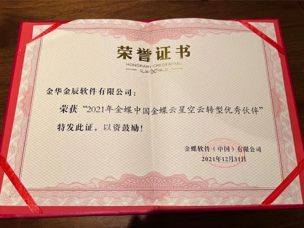 金華金辰軟件有限公司榮獲金蝶集團(tuán)“2021年金蝶中國(guó)云轉(zhuǎn)型優(yōu)秀伙伴”的榮譽(yù)!